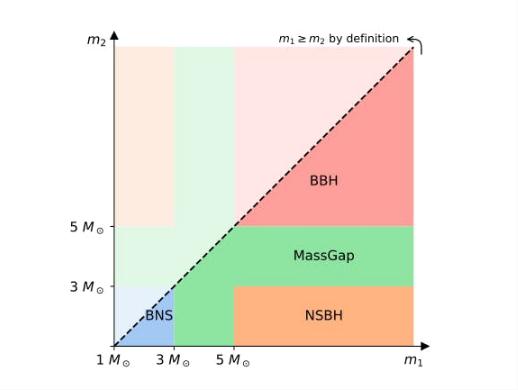 為了弄清楚究竟是哪種合并,天文學家通過分析引力波數據估計出碰撞中每個物體的質量然后弄清楚它們分別是什么。如果兩個物體的質量都在 1 到 3 個太陽質量之間,那么它們很可能是中子星。如果兩個黑洞的質量都大于 5 個太陽質量,那么這個事件很有可能跟兩個黑洞有關。