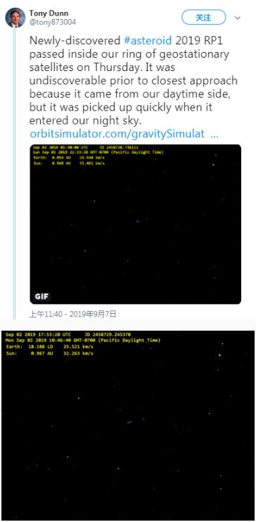 業余天文學家 Tony Dunn 在 Twitter 上報道說,小行星 2019 RP1“在最接近之前是不可發現的,因為它來自我們白天的一面,但是當它進入我們的夜空時它被迅速發現。”