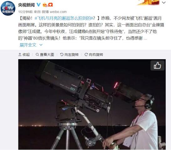 在今年的中秋夜,央視直播團(tuán)隊(duì)用 80 倍長焦鏡頭意外記錄下了“飛機(jī)穿月”這神奇的一幕。現(xiàn)在,央視官方進(jìn)行了揭秘,該作品是央視總臺(tái)“金牌攝像師”汪成健用“神器”80 倍長焦鏡頭拍攝的杰作。