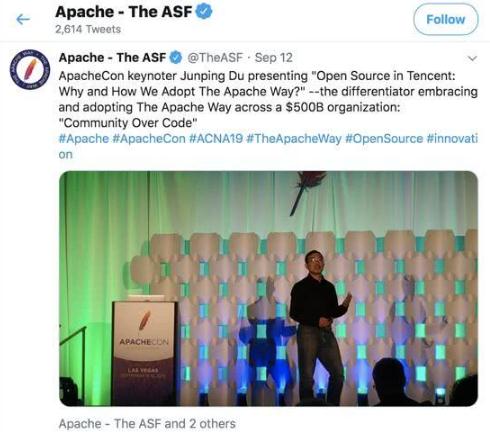 近日,一年一度的國際開源頂會 ApacheCon 2019 在美國舉辦,正值 Apache 軟件基金會(Apache Software Foundation,ASF)成立 20 周年之際,騰訊作為本次大會主會受邀的唯一中國企業(yè),發(fā)表 ApacheCon 的 keynotes 演講。