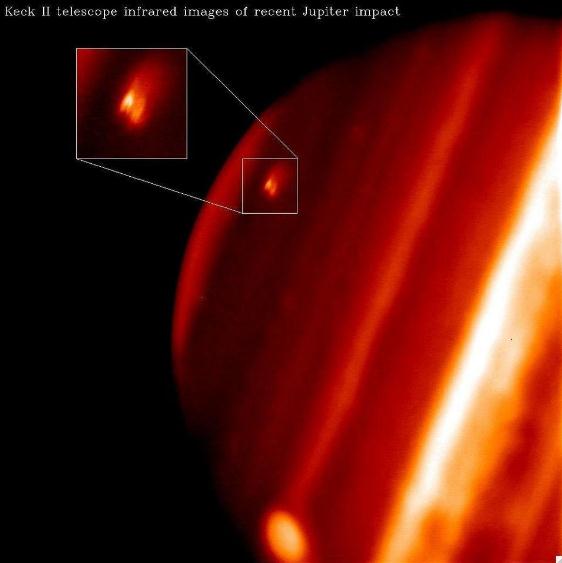 木星撞擊留下了巨大的傷疤,在可見光下可以看到很大的黑點,但在紅外線下可以看到亮點