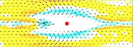 海冰流動(箭頭)、海冰生長對應的放熱(黃色)和海冰融化對應的吸熱(藍色)。紅色點為星下點位置,橫軸為經度(0-360),縱軸為緯度(90S-90N)。