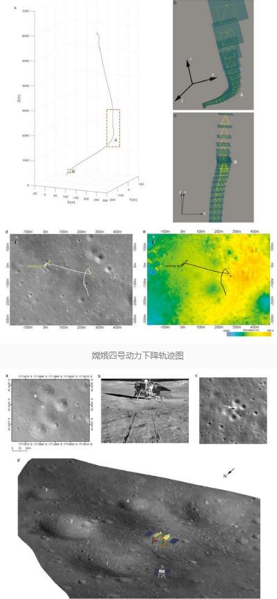 嫦娥四號降落相機拍攝的影像圖會在著陸后通過“鵲橋”中繼衛星傳回地球。利用這些圖像對嫦娥四號著陸軌跡進行重構,文章在三維空間中繪制了探測器的下降軌跡,位置精度可以達到 1m 左右。根據解算的 cm 分辨率地形數據,作者指出嫦娥四號著陸在一個退化撞擊坑的緩坡上,距離北邊一個直徑 25 米的撞擊坑邊緣僅有 8.35m,且著陸點周圍共有五個撞擊坑。隨后,作者結合導航相機拍攝的圖像,精確計算出嫦娥四號的著陸點為東經 177.5991°,南緯 45.4446°,高程-5935 米,并在空間分辨率 7m、5m、1m、10cm 和 5cm 的月球影像和地形數據上進行了精確識別。