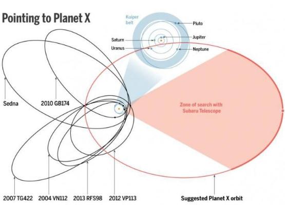 隨后,天文學家又發現大量類似于賽德娜的小行星都具有很大的軌道傾角(幾乎與地球公轉軌道面成 50 度)。于是天文學家猜測,在海王星外的柯伊伯帶,應該有一個質量比較大的天體將賽德娜等小行星拖到了高軌道夾角的位置。
