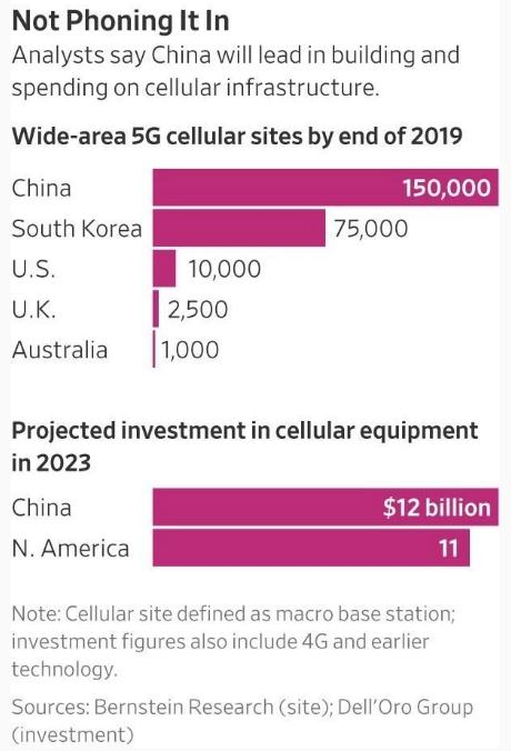 伯恩斯坦公司的萊恩說,到今年年底,中國將有至少 15 萬個 5G 廣域基站可供公眾使用,這一數字將超過任何其他國家。伯恩斯坦公司估計,韓國將以 7.5 萬個此類基站位居第二,而美國到今年年底將擁有 1 萬個 5G 基站。