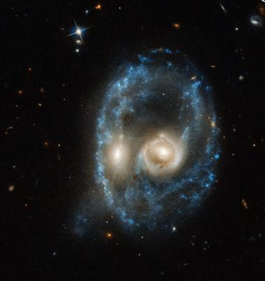這個(gè)星系被稱為 Arp-Madore 2026-424,它位于 7.04 億光年以外。正面碰撞導(dǎo)致產(chǎn)生了異常的環(huán)形形狀。歐空局(ESA)表示說: “環(huán)狀星系很罕見,只有幾百個(gè)存在于我們更大的宇宙社區(qū)。” NASA 和 ESA 共同運(yùn)營哈勃望遠(yuǎn)鏡。