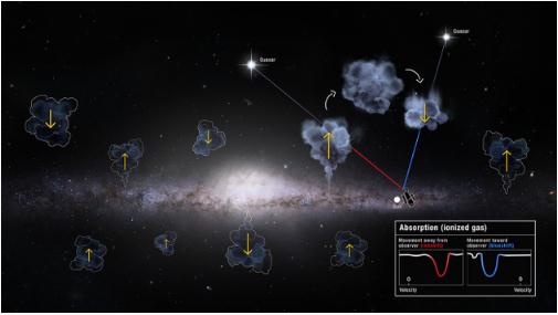這張圖顯示了氣體在銀河系中上升和下落的過程。利用哈勃的宇宙起源頻譜儀 10 年的數據,天文學家發現,進入銀河系的氣體多于離開銀河系的氣體。