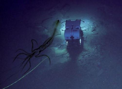 當機器人將明亮的聚光燈照在海床上時,大烏賊的影子輪廓出現在其后部。烏賊顯然對機器人十分感興趣。