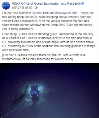 該研究團隊在 Facebook 上寫道: “檢查一下潛伏在深海中的烏賊,當遙控潛水器 Deep Discoverer (D2) 在 Windows to the Deep 2019 中探索陡坡特征時,它會潛入遙控潛水器的上方。是否有一種您被監視的感覺?!”