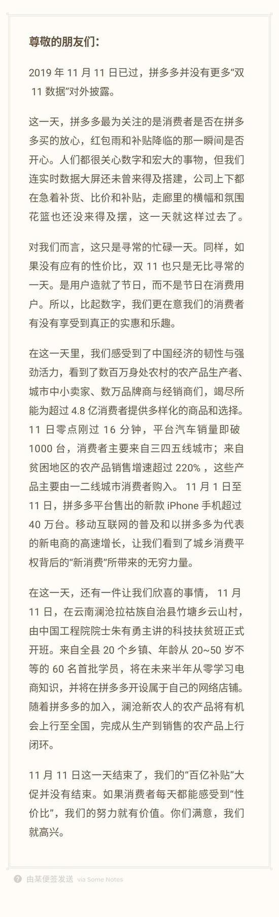11月12日凌晨消息,拼多多發布公開信稱,2019年11月11日已過,公司并沒有更多“雙11數據”對外披露。
