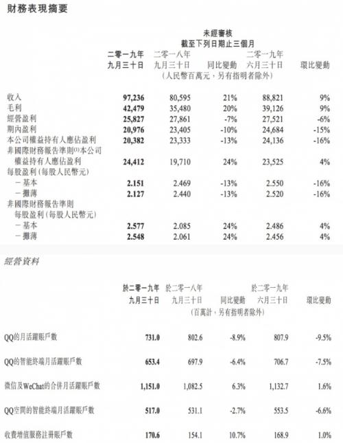 第三季度微信及 WeChat 的合并月活躍賬戶數達 11.51 億,同比增長6%。QQ 的智能終端月活躍賬戶數為 6.534 億,相比去年同期下跌6%。本季度騰訊升級了安全策略,主動清理了濫發信息及有惡意機器人活動的賬戶。