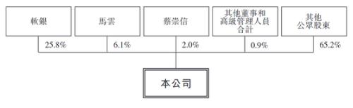 招股書顯示,阿里巴巴集團目前的股權結構為,截至最后實際可行日期,軟銀實益擁有約25.8%已發行在外股份,是最大股東。本次全球發售完成后,軟銀將保持其最大股東地位。截至最后實際可行日期,馬云和蔡崇信分別實益擁有約6.1%和約2.0%已發行在外股份。截至最后實際可行日期,董事和高級管理人員(包括馬云和蔡崇信)共計擁有約9.0%已發行在外股份。