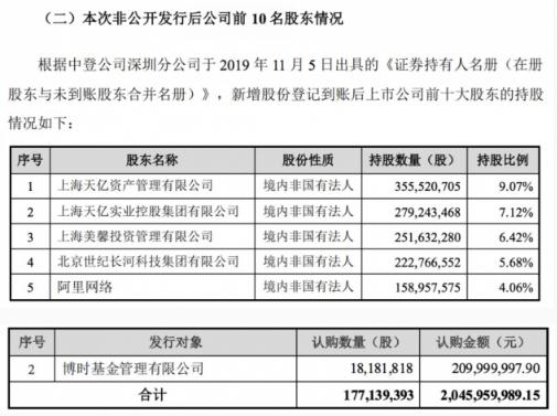 11 月 14 日消息,美年健康今日發(fā)布公告稱,計(jì)劃非公開發(fā)行 177,139,393 股股份,募集資金總額為2,045,959,989.15 元。其中,阿里網(wǎng)絡(luò)認(rèn)購1,835,959,991.25 元,獲 4.06% 股份;博時(shí)基金管理有限公司認(rèn)購 209,999,997.90。