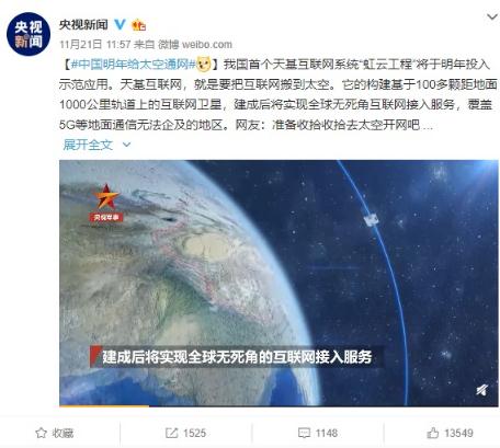 央視新聞近日報道,我國首個天基互聯(lián)網(wǎng)系統(tǒng)「虹云工程」將于 2020 年投入示范應(yīng)用。