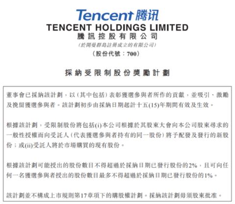 據11月25日晚上消息,騰訊控股在港交所發布公告,為表彰獲選參與者所做的貢獻,并吸引、激勵及挽留獲選參與者,公司董事會已采納受限制股份獎勵計劃,該計劃初步將于采納日期起15年內有效及生效。根據該計劃可能授出的股份數目不得超過于采納日期已發行股份的2%,且可向任何一名獲選參與者授出的股份數目最多不得超過于采納日期已發行股份的1%。