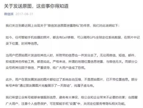官方表示,微信發(fā)原圖或泄露位置信息這個(gè)話題已經(jīng)不是第一次辟謠了,2017 年他們就有關(guān)相關(guān)辟謠,詳細(xì)內(nèi)容如下: