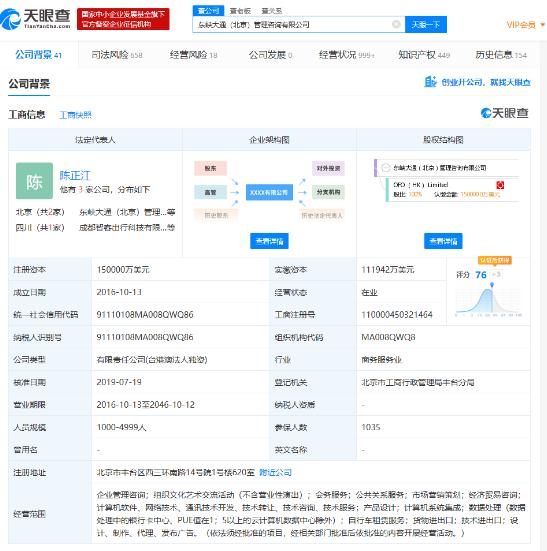 天眼查數據顯示,ofo 運營主體為東峽大通(北京)管理咨詢有限公司,該公司成立于 2016 年 10 月,注冊資本為 15 億美元,法定代表人為中國區業務主要負責人之一陳正江,是 OFO (HK) Limited 的全資子公司。