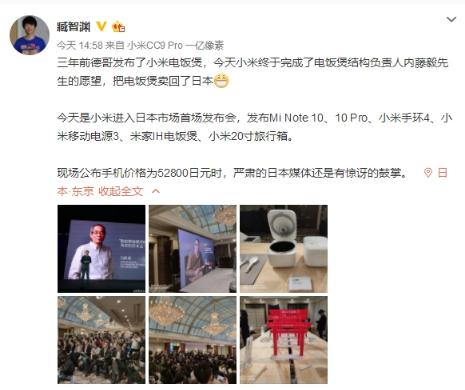 小米集團國際部總裁、CFO 周受資表示:“小米終于把電飯煲賣回了日本!……小米將為日本市場帶來更多感動人心,價格厚道的好產(chǎn)品!”