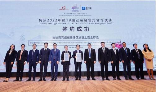 在現(xiàn)場,杭州亞組委和阿里巴巴還通過螞蟻金服區(qū)塊鏈可信存證技術(shù)簽約,為大型綜合國際賽事首創(chuàng)。
