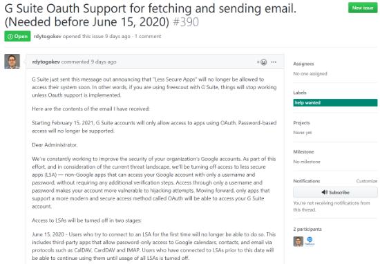 FreeScout 開發(fā)者提出疑問:“屆時對 G Suite 的 IMAP 請求都將通過 OAuth 發(fā)出,為什么 Google 不只允許將 OAuth 令牌作為 IMAP 密碼傳遞?這樣一來,所有現(xiàn)有的 IMAP 庫將可以繼續(xù)運行。”