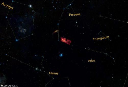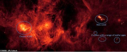 英仙座分子云位于英仙座的邊緣,其中含有大量新生的恒星,包含了超過 10000 個太陽質量的氣體和塵埃。從這些氣體和恒星發出的紅外光是人眼看不見的,但斯皮策望遠鏡可以捕捉到溫暖天體的圖像。