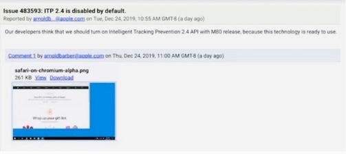 據了解,早先蘋果就推出過基于 Windows 平臺的 Safari 瀏覽器,但這一項目在幾年前停止了開發。現在,一名蘋果員工邀請 Chromium 開發人員在 Chromium 80 的問題追蹤工具中激活“智能跟蹤預防”技術的標記。
