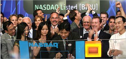 2005 年 8 月,百度正式掛牌納斯達克證劵交易所,發行價為 27 美金。開盤價為 66 美金,IPO 首日收盤于 122.54 美金,漲幅高達 354%,創當時美國股市 5 年來新高,市值達 39.58 億美金,為中概股最輝煌記錄之一。