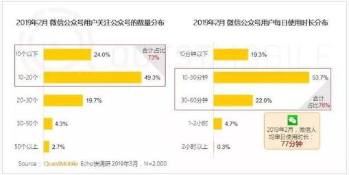 更重要的是,微信推送限制的放開已經(jīng)迫在眉睫。因為,微信迫切需要提升當(dāng)前微信公眾號平臺的活躍度。根據(jù)微信官方此前透露的信息,微信公眾號數(shù)量已經(jīng)突破 2000 萬。另據(jù) QuestMobile 數(shù)據(jù)顯示,雖然 80% 微信用戶使用了公眾號,但是 2019 年 2 月,73% 的用戶關(guān)注的公眾號數(shù)量低于 20 個,其中,24% 的用戶低于 10 個,近 50% 只有 10-20 個。這意味著,眾多的公眾號處于一個無人問津和無人關(guān)注的狀態(tài)。