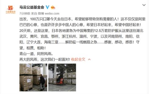 今天,馬云公益基金會、阿里巴巴公益基金會通過微博中表示,將捐贈 100 萬只口罩用于支持日本“抗疫”。