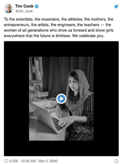 庫克的 Twitter 消息中包括了一段 40 秒長的視頻,其中包含了碧昂絲的歌曲《Flawless》,以及使用 MacBook 的女性形象。視頻中出現的其他女性還包括歌手 Lady Gaga、南非由女性運營的反偷獵組織“黑曼巴”,以及巴基斯坦的社會活動家馬拉拉·尤薩福扎伊(Malala Yousafzai)。