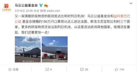 馬云公益基金會(huì)發(fā)布微博稱,“又一架滿載防疫物資的航班抵達(dá)比利時(shí)列日機(jī)場(chǎng)!馬云公益基金會(huì)和阿里巴巴公益基金會(huì)捐贈(zèng)的 150 萬只口罩將從這兒送達(dá)法國(guó)、斯洛文尼亞和比利時(shí)三個(gè)國(guó)家。更多的防疫物資還會(huì)運(yùn)到列日機(jī)場(chǎng),從這里送達(dá)歐洲其他國(guó)家。疫情還在蔓延,我們還要更快一點(diǎn)!”