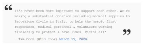 “相互支持從來(lái)沒(méi)有像現(xiàn)在這樣重要。我們正準(zhǔn)備向意大利的公民組織 Protezione Ciile 提供包括醫(yī)療用品在內(nèi)的大量捐贈(zèng),以幫助英勇的急救人員、醫(yī)務(wù)人員和志愿者不知疲倦地保護(hù)和拯救生命。”庫(kù)克在 2020 年 3 月 19 日發(fā)推文稱。