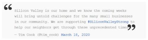 “硅谷是我們的家,我們知道未來(lái)幾周我們社區(qū)的許多小企業(yè)都會(huì)面臨無(wú)盡的挑戰(zhàn)。我們支持#SiliconValleyStrong 計(jì)劃,希望幫助我們的鄰居度過(guò)這個(gè)前所未有的時(shí)期。”庫(kù)克在 2020 年 3 月 18 日發(fā)推文稱。