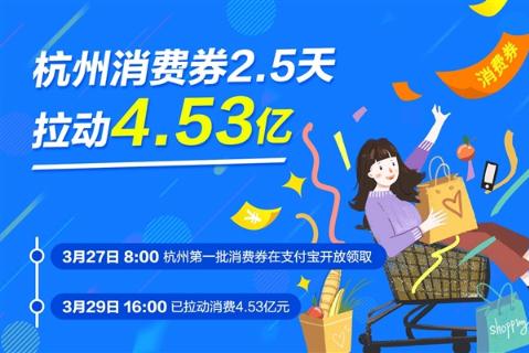 3 月 27 日 8 時,杭州第一批消費券在支付寶開放領取。截至 29 日 16 時,僅僅兩天半時間,就已拉動消費 4.53 億元。