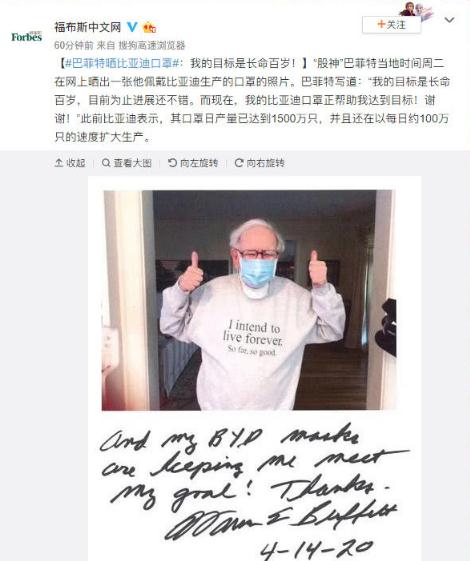 巴菲特寫道:“我的目標是長命百歲,目前為止進展還不錯。而現在,我的比亞迪口罩正幫助我達到目標!謝謝!”