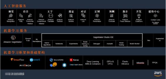 底層是機器學習框架和基礎架構,AWS 支持 TensorFlow、PyTorch、Apache MXNet、Chainer、Gluon、Horovod 和 Keras 等機器學習框架。在基礎架構方面,AWS 虛機提供各種各樣的實例,同時提供現成的亞馬遜機器鏡像 AMI(Amazon Machine Image)。