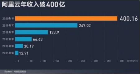 財報顯示,2020 財年內(2019 年 4 月至 2020 年 3 月底),阿里云營收為 400.16 億元。對比歷史數據,2015 財年阿里巴巴首次披露云計算營收,當年阿里云收入為 12.71 億元,到現在年度營收 400 億元,六年間增長 31 倍。