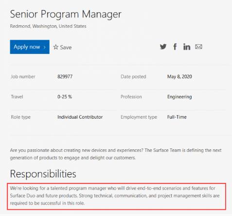 在全力以赴推動雙屏手機 Surface Duo 今年上市的同時,最新招聘信息顯示微軟已經(jīng)開始籌備下一代產(chǎn)品的開發(fā)事宜。在招聘信息中寫道:“我們正在尋找一位優(yōu)秀的項目經(jīng)理,他將推動 Surface Duo 和未來產(chǎn)品的端到端應(yīng)用場景和功能的開發(fā)。要想成功擔任此職位,需要具備較強的技術(shù)、溝通和項目管理能力。”