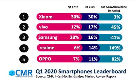 5 月 31 日,據媒體報道,CMR 發布 2020 年 Q1 印度智能手機品牌出貨量 TOP5,小米、vivo、realme、OPPO 榜上有名,三星屈居第三。