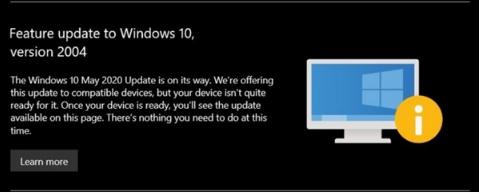 據最新消息顯示,微軟已面向主流用戶推送 Windows 10 May 2020(20H1/Version 2004)功能更新,用戶也可以手動檢查更新。自 5 月 29 日開始,微軟向那些無法升級新系統的用戶發送通知,表示由于用戶設備還沒有準備好所以無法進行升級。