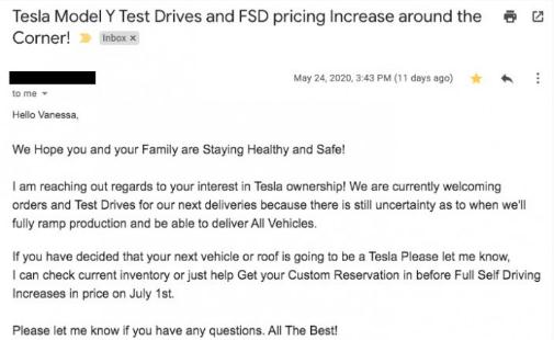 特斯拉 Model Y 即將開始接受消費者的預約試駕,源自外媒報道的國外一名消費者收到的試駕郵件。