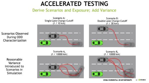所以,我們可以把上述步驟分為兩大類,即真實世界的測試里程,以及仿真環境里加速測試里程。這里的“加速”不僅是指時間上的加速,還包括了場景構建,或是其他變化的加速,從而獲得更高質量的驗證里程數。