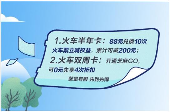 2、火車雙周卡:開通芝麻GO,可0元享4次折扣。