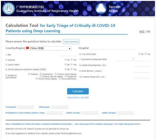 此項研究基于人工智能深度學習所建立的生存模型,對 COVID-19 患者入院時的 10 項臨床特征進行分析,可以幫助預測患者發展至危重病情的風險,如在患者住院期間持續采用此模型進行分析,預測結果會更加準確,有助于監測患者住院期間的風險趨勢。依據此模型開發出的預測工具“COVID-19 患者重癥早期分診系統”已經在線公開于 https://aihealthcare.tencent.com/COVID19-Triage_en.html,臨床醫護工作人員也可以訪問微信小程序獲得這一工具。