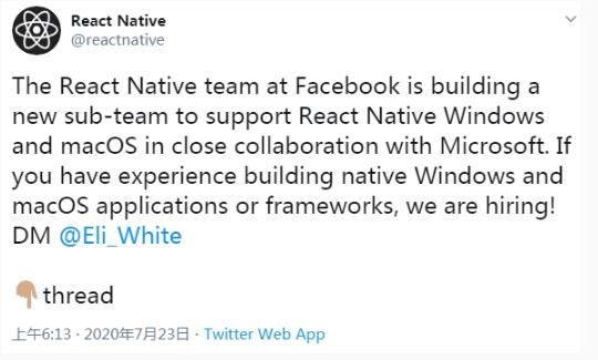 昨日,Facebook 宣布與微軟達成了更進一步的合作,通過創建一個新的子團隊,來改善 Windows 和 macOS 上的 React Native 體驗。