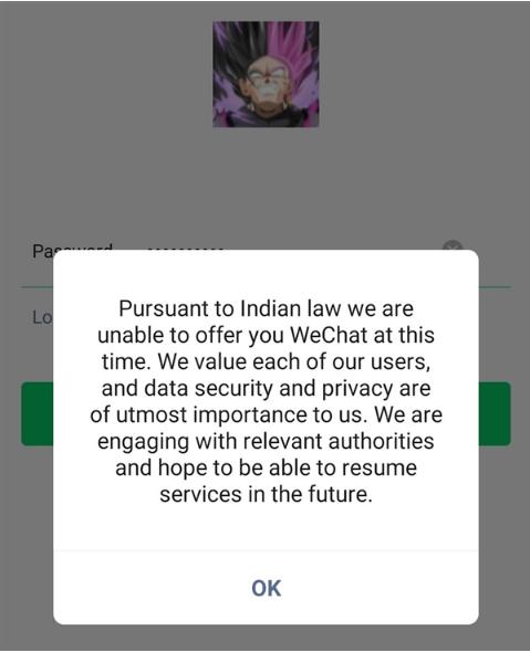“依據(jù)印度法律,我們目前無法向您提供微信服務(wù)。我們尊重每一位用戶,數(shù)據(jù)安全和隱私對(duì)我們而言是最重要的。我們正在與有關(guān)部門積極協(xié)調(diào),希望能在未來恢復(fù)服務(wù)。”