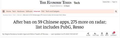 7 月 27 日,據(jù)印度《經(jīng)濟(jì)日?qǐng)?bào)》報(bào)道,它們得到的消息顯示,印度繼此前宣布推出針對(duì)中國(guó) 59 款 App 的禁令后,再次推出新計(jì)劃,將審核 275 款中國(guó)開發(fā)商的 App,該消息一出,令不少網(wǎng)友嘩然。目前,雖不知道印度是否會(huì)對(duì)這些 App 推出同樣的禁令,但是參照此前的情況,這批 App 中可能會(huì)有一部分面臨同樣的結(jié)果。