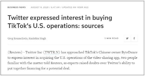美國總統特朗普以所謂“國家安全”為由下令封殺 TikTok 后,微軟正積極行動將其納入旗下,而華爾街日報、路透社 9 日先后援引消息人士爆料,社交媒體巨頭推特(Twitter)也瞄向 TikTok,有意合并其業務。