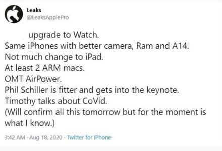 據知名爆料達人@LeaksApplePro 最新在 Twitter 上發布的消息顯示,全新的 iPhone 12 的相機將比以往更強大,同時還會增加運存,且將全系搭載 A14 芯片,并且至少會發布兩款基于 ARM 的 Mac 產品,而此前被砍掉的無線充電板 AirPower 這次也將重新與大家見面。除此之外,此前還有消息稱全新的 AirPods Studio、HomePod Mini、AirTags 以及新款 Apple TV 都有可能隨之亮相。