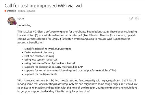 Ubuntu 開發人員正在考慮使用 Intel IWD 作為 iNET 無線守護程序,以期取代 WPA_Supplicant,提供更好的 WiFi 體驗。
